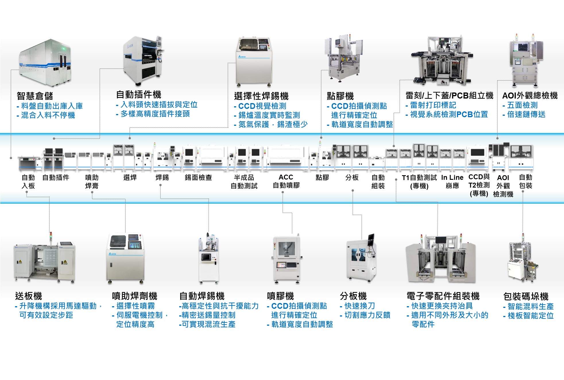隨著人口紅利下降,勞動力成本提升,企業紛紛於生產製程內導入自動化設備,取代勞動密集的人工操作。自動化設備所帶來的經濟效益,儼然成為創造企業價值與提升產業競爭力的關鍵之一。 身為全球電子製造龍頭廠,台達憑藉豐富的製造經驗以及在工業自動化產品的研發能力,開發出符合市場需求的自動化設備。針對電子組裝、太陽能…等行業需求,以及雷射、繞線、自動化光學檢測等技術應用,台達提供高效率、高精度、高可靠度的產品及解決方案。不僅可協助客戶有效提高產能、改善品質,更可降低人力費用和生產成本,節約材料及設備能源損耗,全面提升競爭力。